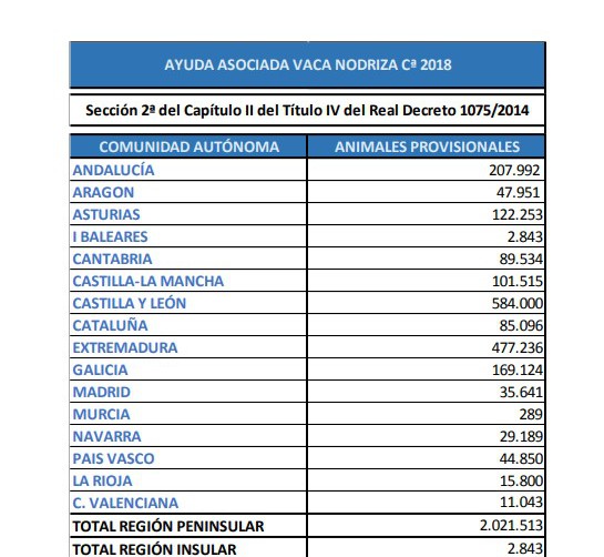 El número de animales admitidos en las solicitudes de la ayuda a la vaca nodriza que cumplen el condicionado de las mismas de manera provisional serían 2.021.513 en la región Peninsular, que deben repartirse un presupuesto de 187,2 millones de euros (una vez descontado lo que corresponde al régimen de pago de pequeños agricultores), lo que arroja un importe unitario de 91,821657 €/animal. En la campaña pasada la ayuda definitiva fue de 91,83 €/animal, es decir, se ha reducido mínimamente al haberse incrementado el número de animales con derecho a ayuda.